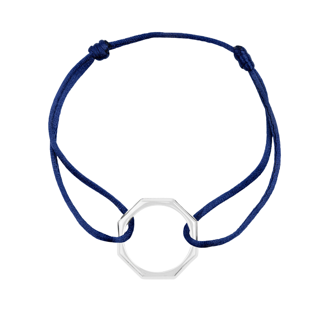 Le bracelet GUS est un bijou élégant et raffiné conçu pour mettre en valeur votre poignet. La forme octogonale de l'anneau en argent 925 confère au bracelet une apparence unique et originale. Les cordons en satin de 10 couleurs différentes viennent se fixer sur l'anneau grâce à des noeuds coulissants, ce qui permet de régler facilement la longueur du bracelet selon votre convenance.