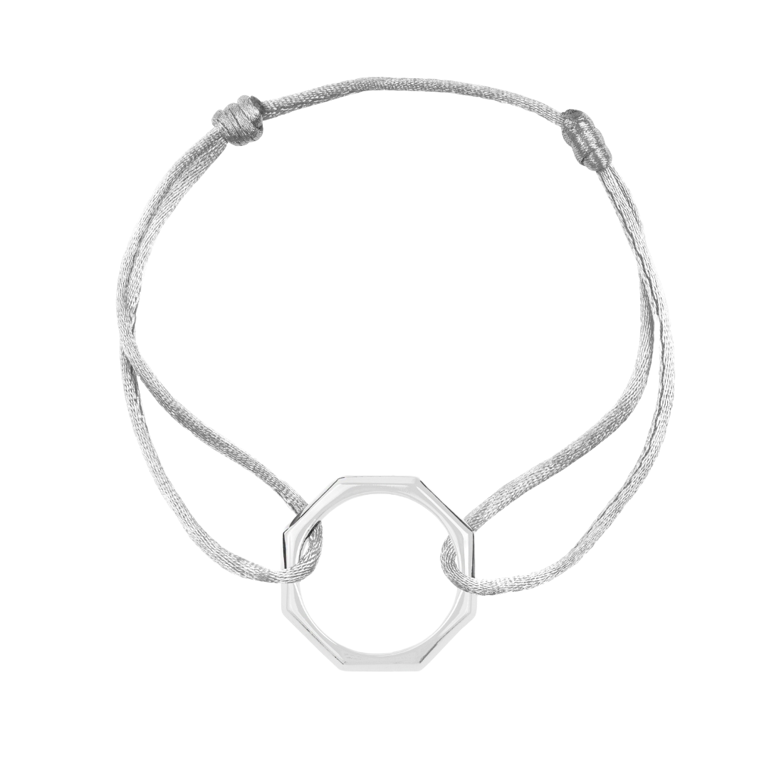 Le bracelet GUS est un bijou élégant et raffiné conçu pour mettre en valeur votre poignet. La forme octogonale de l'anneau en argent 925 confère au bracelet une apparence unique et originale. Les cordons en satin de 10 couleurs différentes viennent se fixer sur l'anneau grâce à des noeuds coulissants, ce qui permet de régler facilement la longueur du bracelet selon votre convenance.